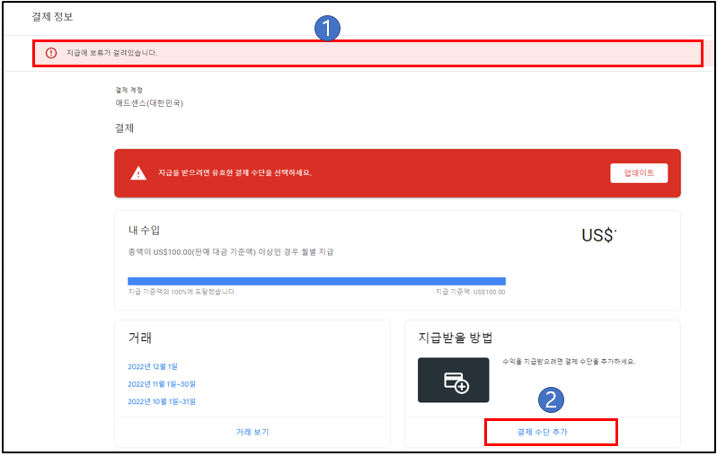- 계좌 등록 순서 : 애드센스 왼쪽 화면 메뉴 - [지급] - [결제 정보] - [결제 수단 추가].